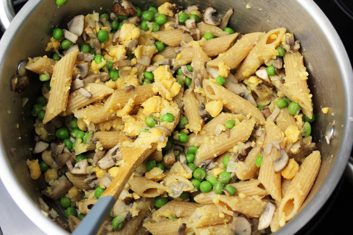 - Pour over pasta and garbanzo mixture. Add in mushrooms and peas and mix together well.