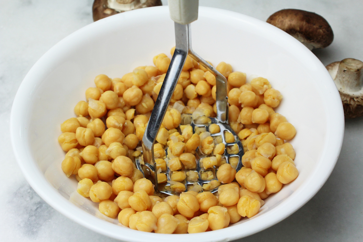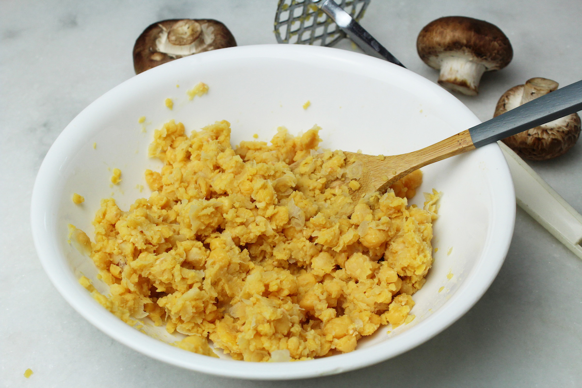- With a food processor, fork, or potato masher, break up garbanzo beans. Don’t make mushy; keep some of the texture. Add to the pasta and mix together well.