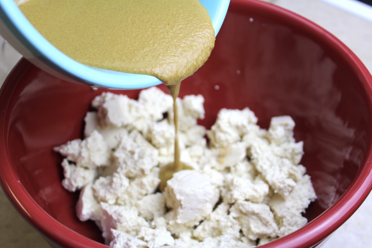 - Mix batter ingredients well in a small bowl and pour over tofu. Using a spatula, gently toss, making sure all the tofu is coated.