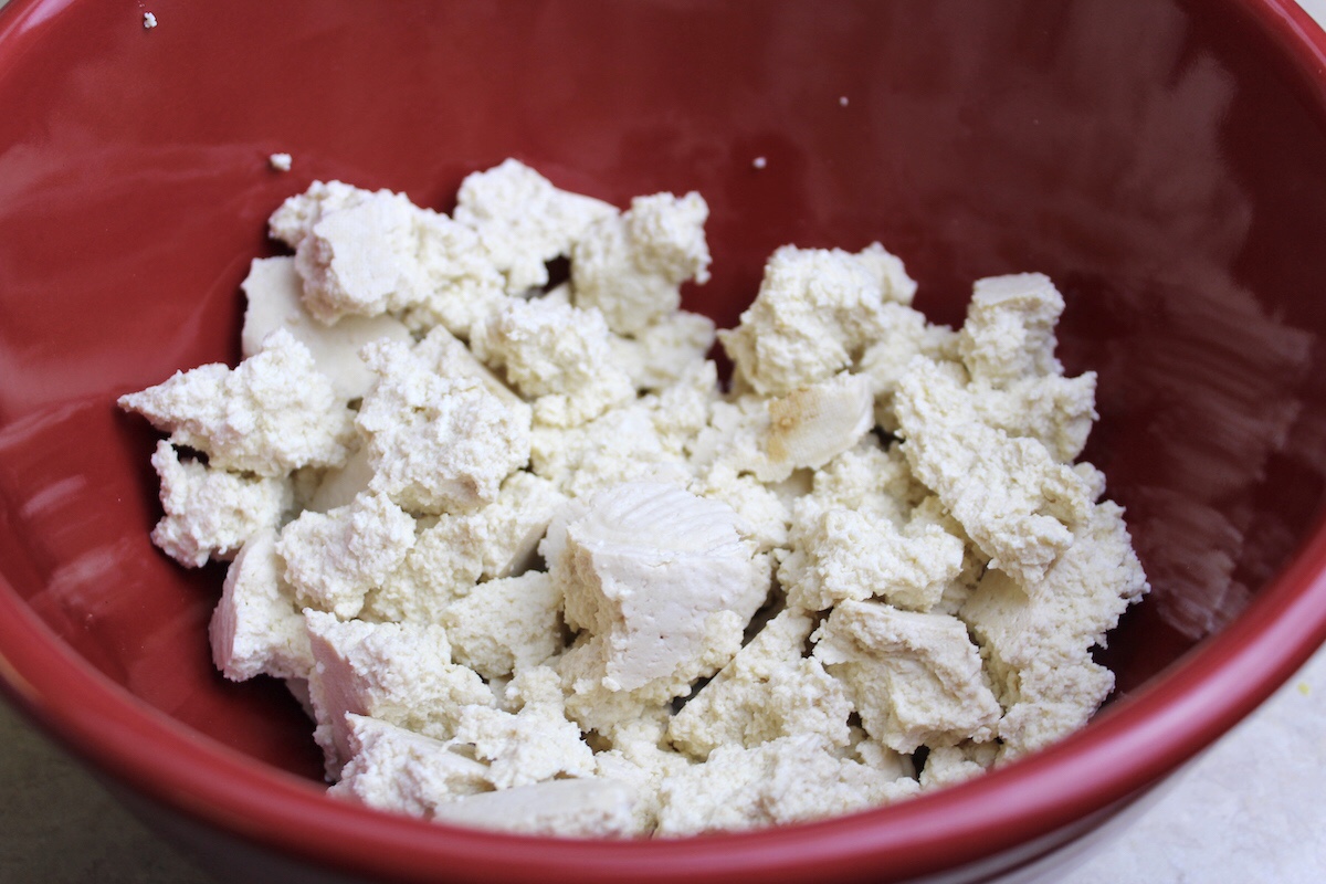 - In a large bowl, use hands to break up tofu into little “nugget” shapes.